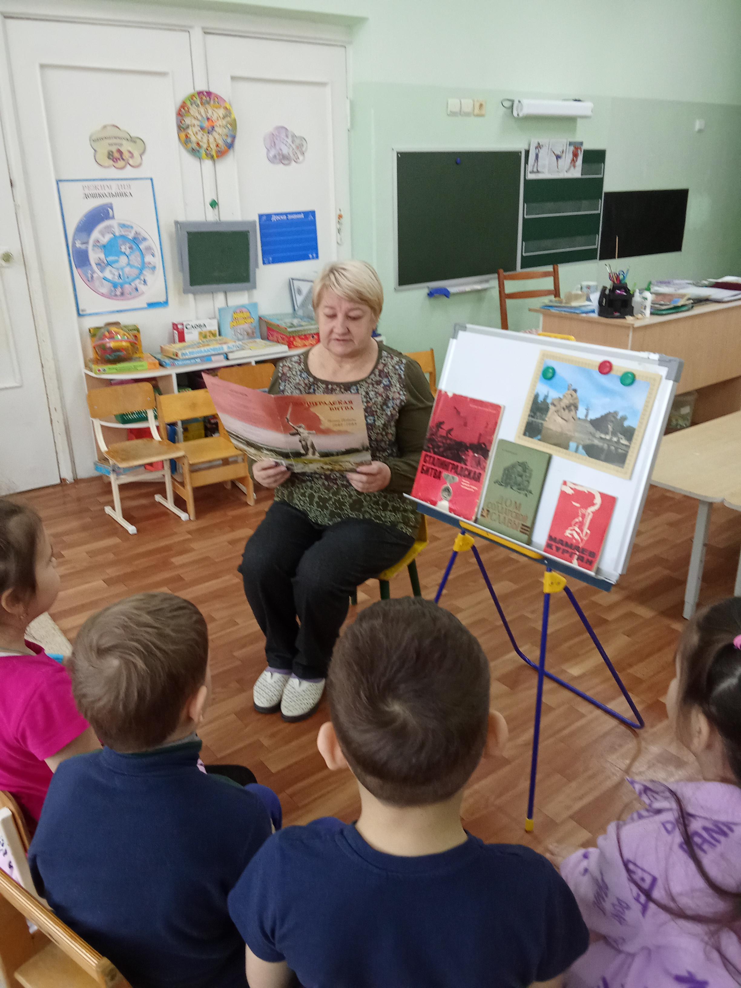 В день празднования 79 годовщины разгрома немецких войск под Сталинградом с детьми была проведена беседа " Сталинградская битва", показана презентация " Опалённый Сталинград!", дети рассматривали книги, играли в игру " Сталинградская битва".